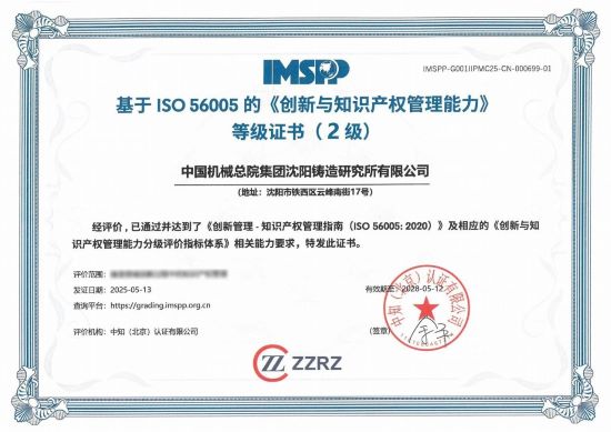 近日,中国机械总院集团沈阳铸造研究所有限公司(以下简称“沈铸所”) 通过近半年的对标运行实施,从知识产权战略、创新战略与业务战略相协调,到知识产权与创新全过程进一步有机融合,成功获得中知(北京)认证有限公司颁发的基于ISO 56005的《创新与知识产权管理能力》等级证书(2级),跻身东北地区首批获得2级证书的企业,为ISO 56005国际标准在东北地区的推广再添助力。