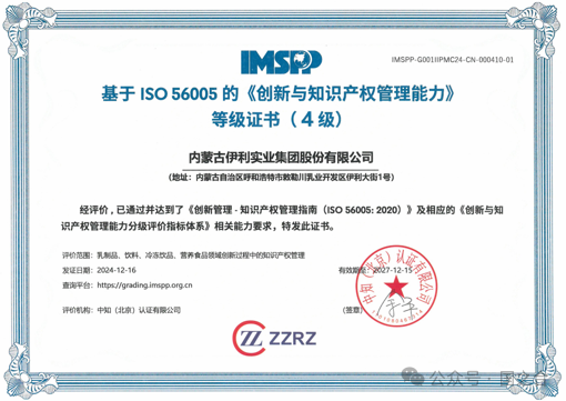 近日,在2025年度ISO 56005创新与知识产权管理能力分级评价优秀案例评选中,内蒙古伊利实业集团股份有限公司荣获“行业标杆”奖,成为全国食品行业创新与知识产权管理能力建设的一面旗帜。