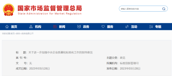 为全面贯彻习近平总书记关于质量和标准化工作的重要论述和党中央、国务院决策部署,推进质量强国建设,落实《国家标准化发展纲要》,充分发挥中央企业在质量和标准化工作中的示范带动作用,推动中央企业进一步转变发展方式,提高产品服务质量和效益效率,加快建设产品卓越、品牌卓著、创新领先、治理现代的世界一流企业,培育以技术、标准、品牌、质量、服务等为核心的竞争合作新优势,实现质量更好、效益更高、竞争力更强、影响力更大的发展,国家市场监督管理总局发布了《关于进一步加强中央企业质量和标准化工作的指导意见》,阅读全文请点击“这里”